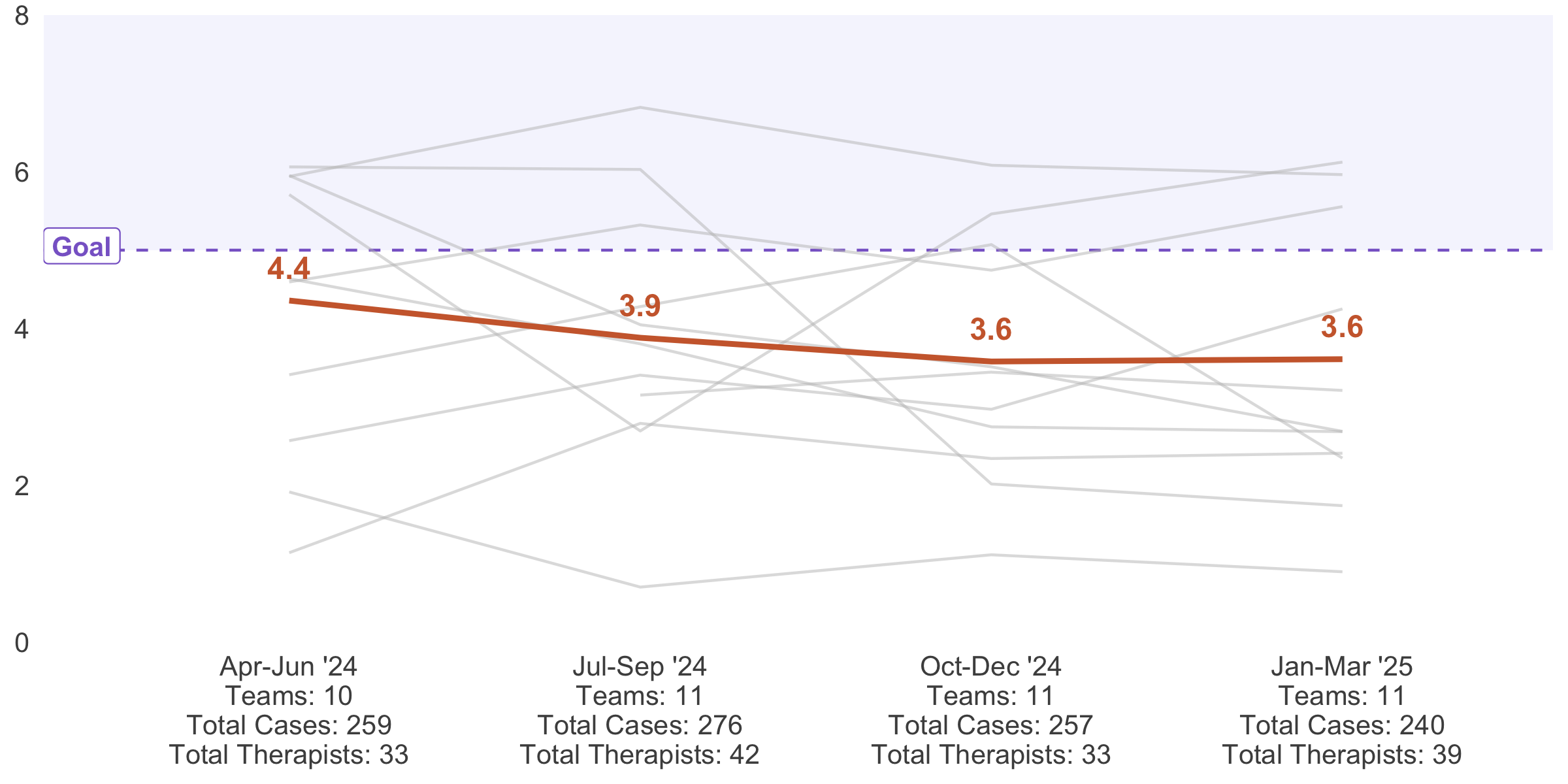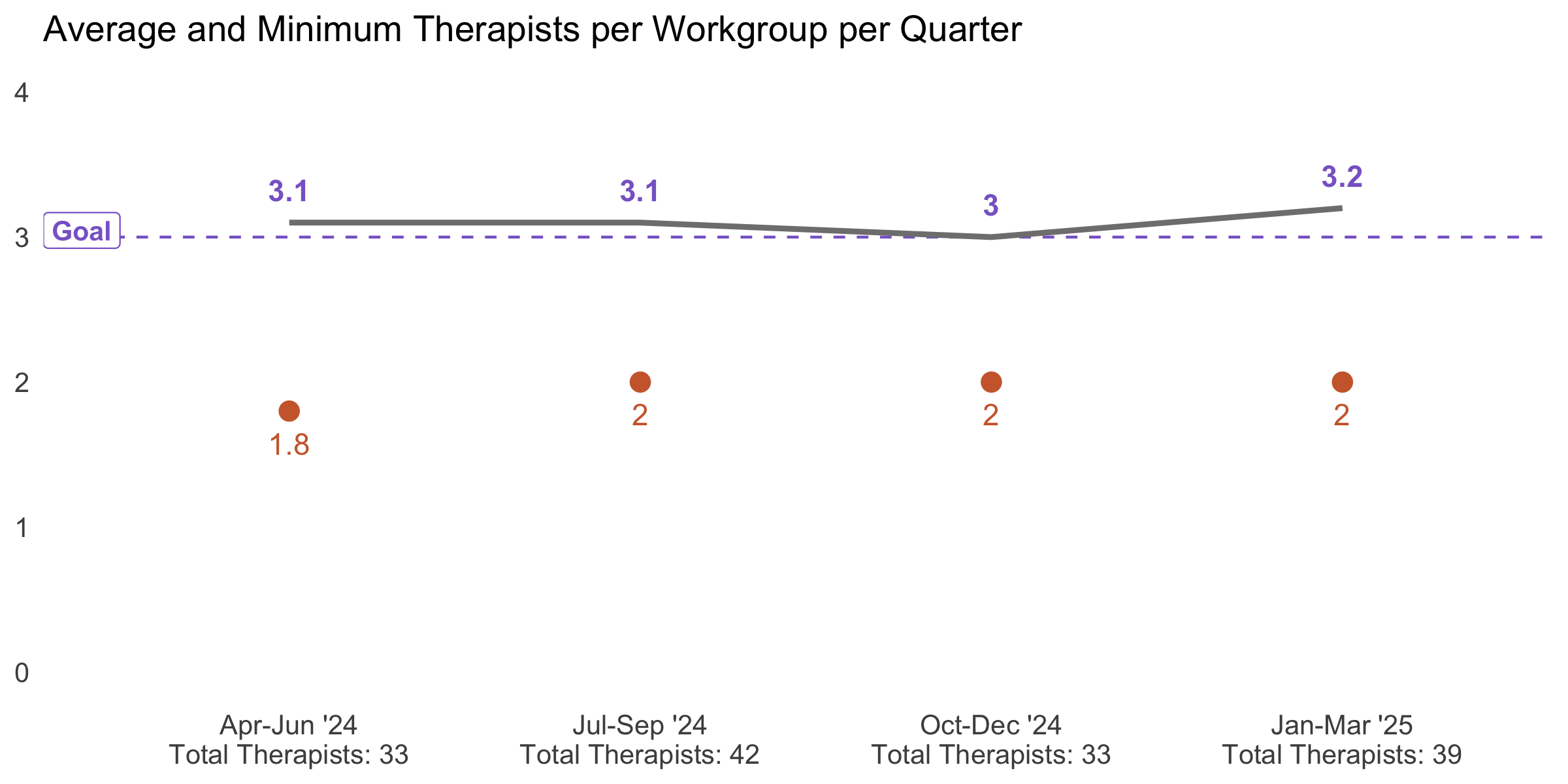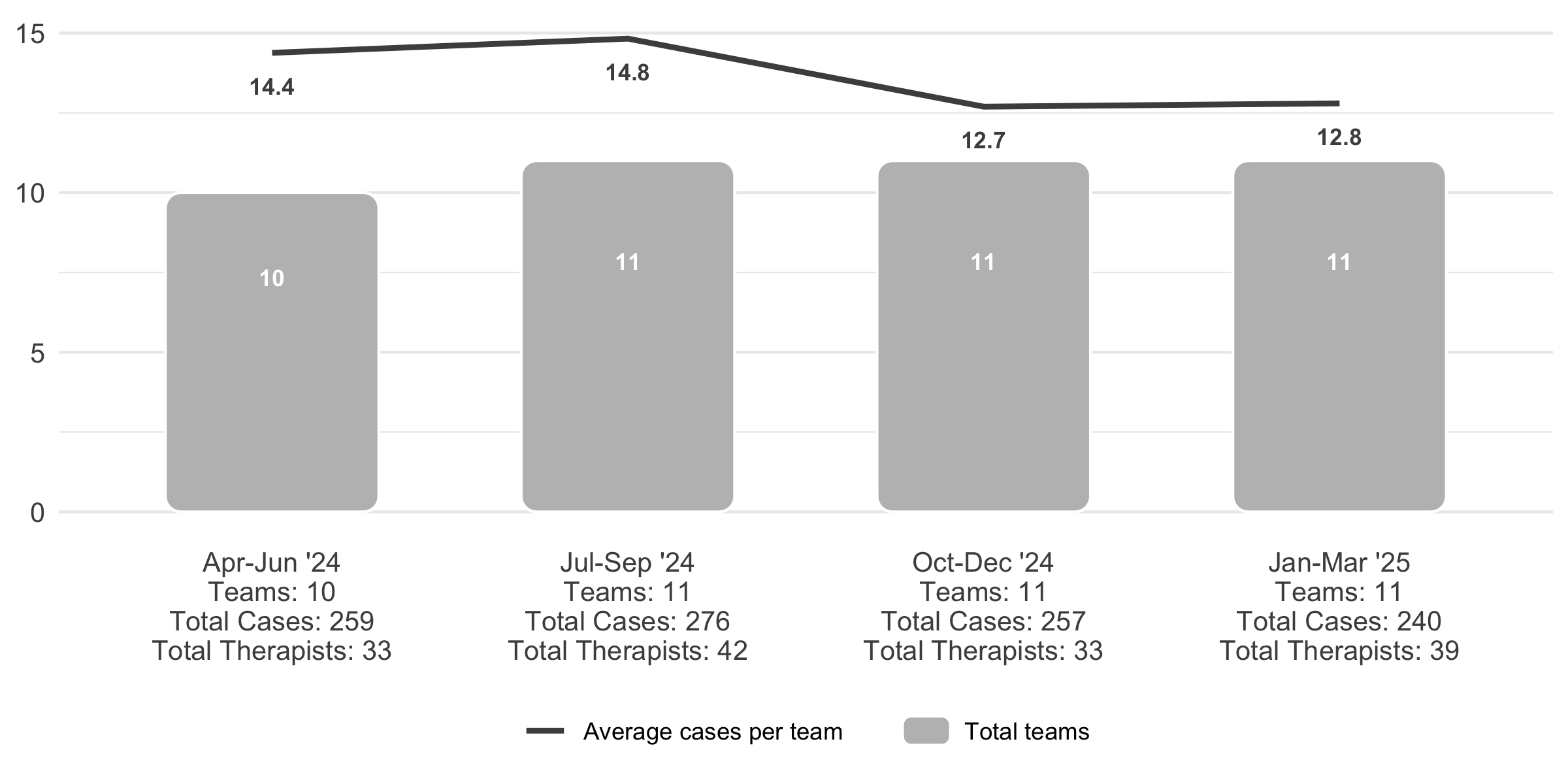 FFT, LLC, the training organization for the model, has set a target of three therapists per team, represented by the dashed line in Figure 2. In Q1 2025, the average number of therapists per team, weighted for the number of days they served on the team in the quarter and removing supervisors who don’t carry cases, rose slightly to 3.2. The orange dots represent the team with the lowest number of therapists for each reporting period.