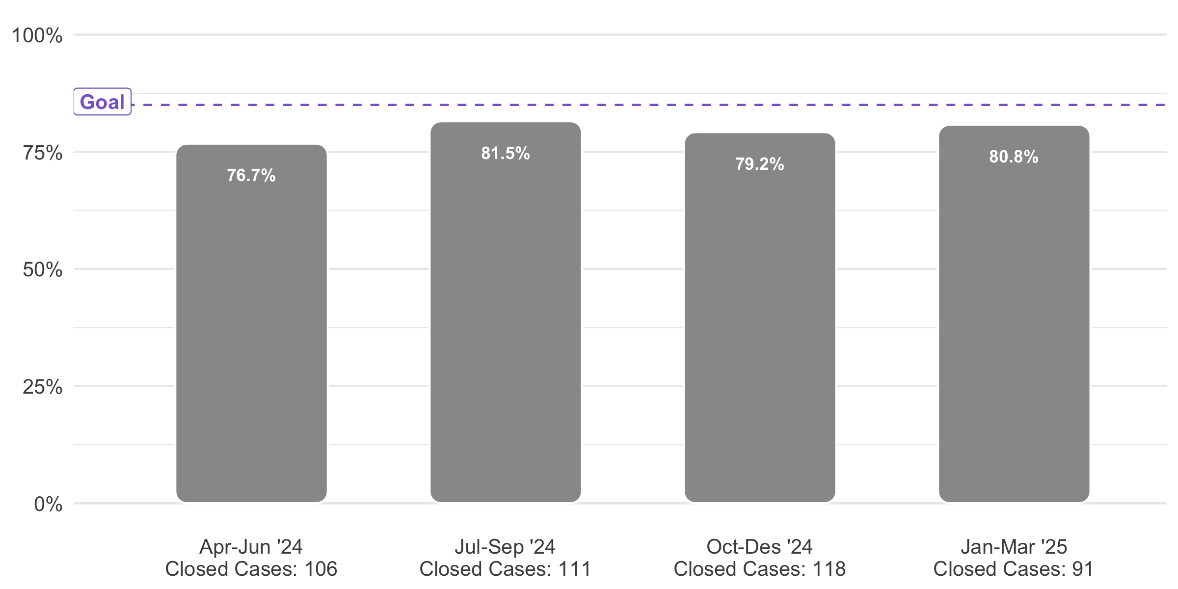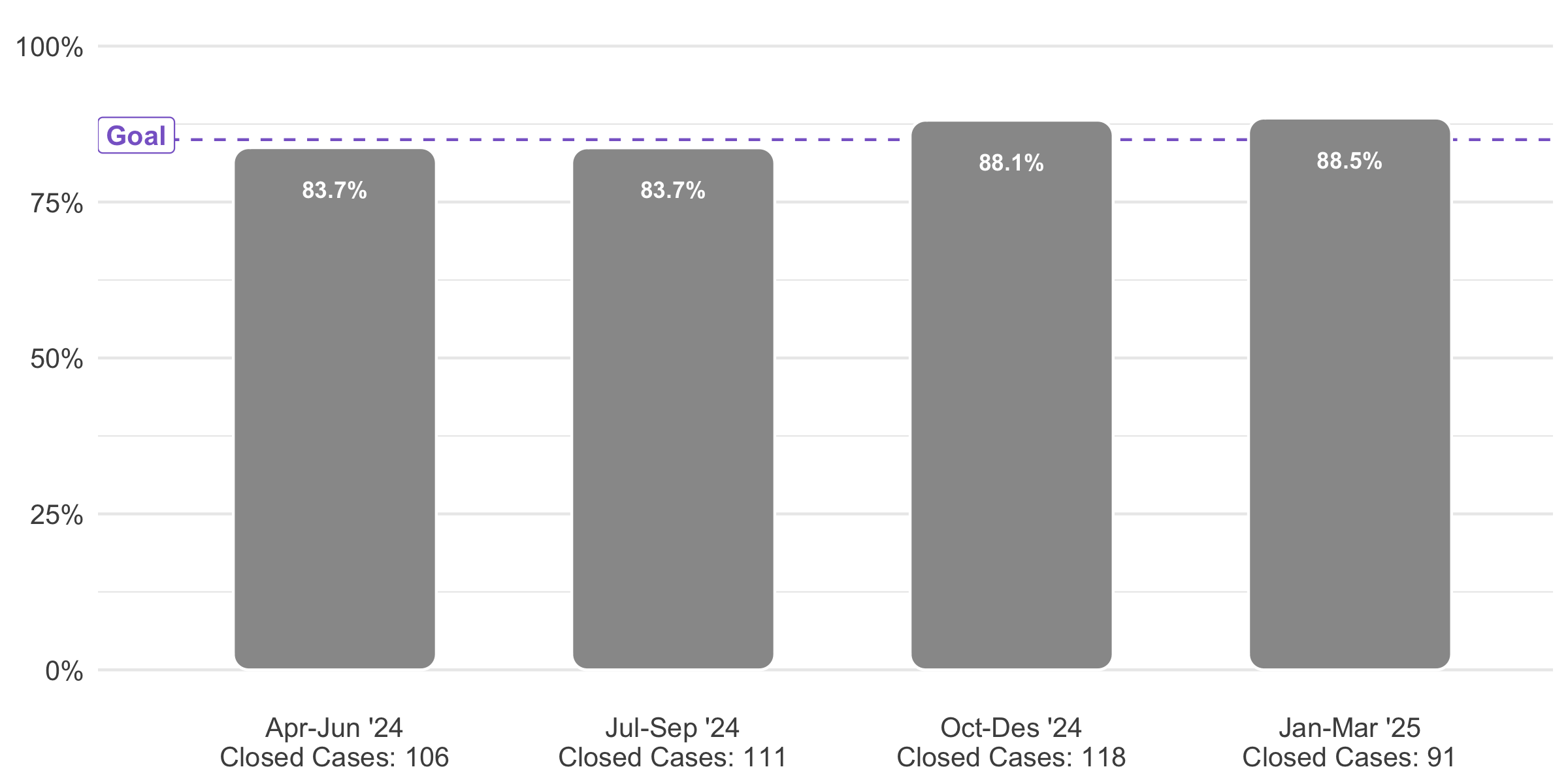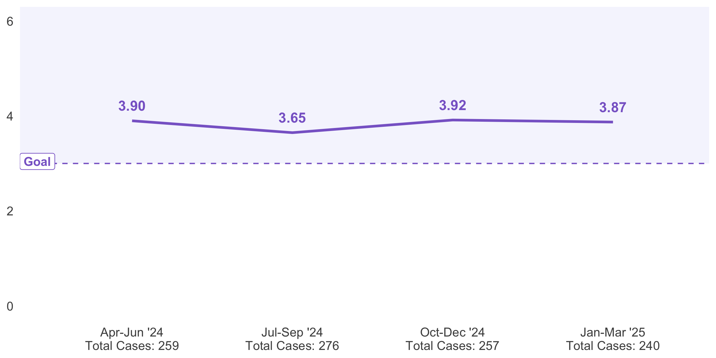FFT, LLC, the training organization for the model, has set a target of three therapists per team, represented by the dashed line in Figure 2. In Q1 2025, the average number of therapists per team, weighted for the number of days they served on the team in the quarter and removing supervisors who don’t carry cases, rose slightly to 3.2. The orange dots represent the team with the lowest number of therapists for each reporting period.