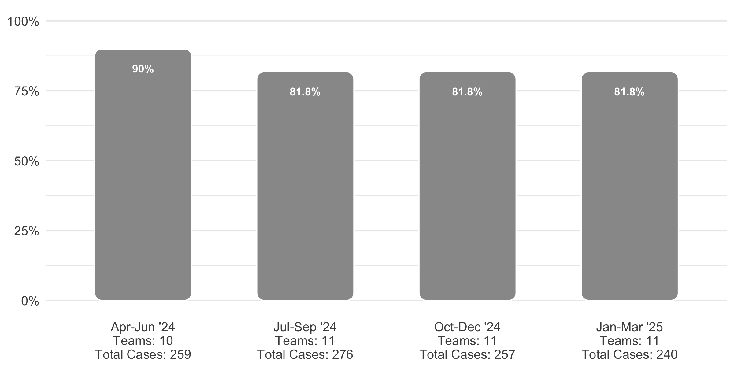 Another way to consider fidelity data is depicted in Figure 5: the percentage of teams averaging the FFT, LLC final fidelity score of 3.0 or higher in a given quarter. For the last three quarters, nine of the 11 teams maintained an average fidelity above the threshold.